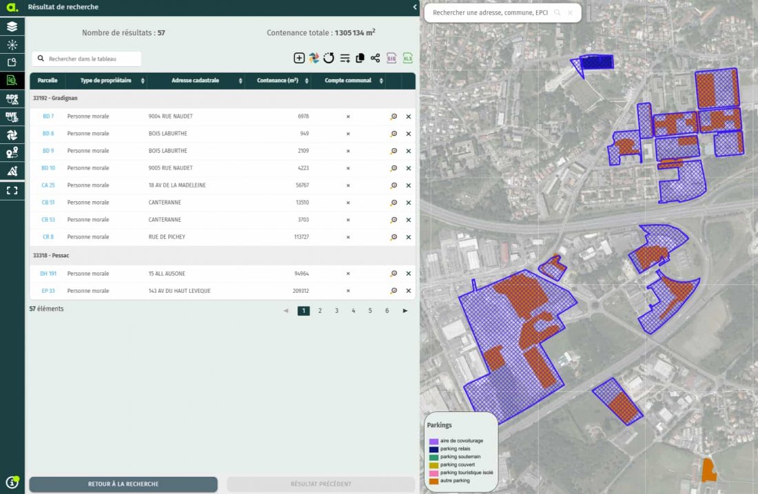 - obtenir une vision claire du potentiel avant même de se déplacer sur site grâce à un tableau regroupant sur le foncier clé : l’adresse du parking, la superficie, les propriétaires personnes morales, etc.